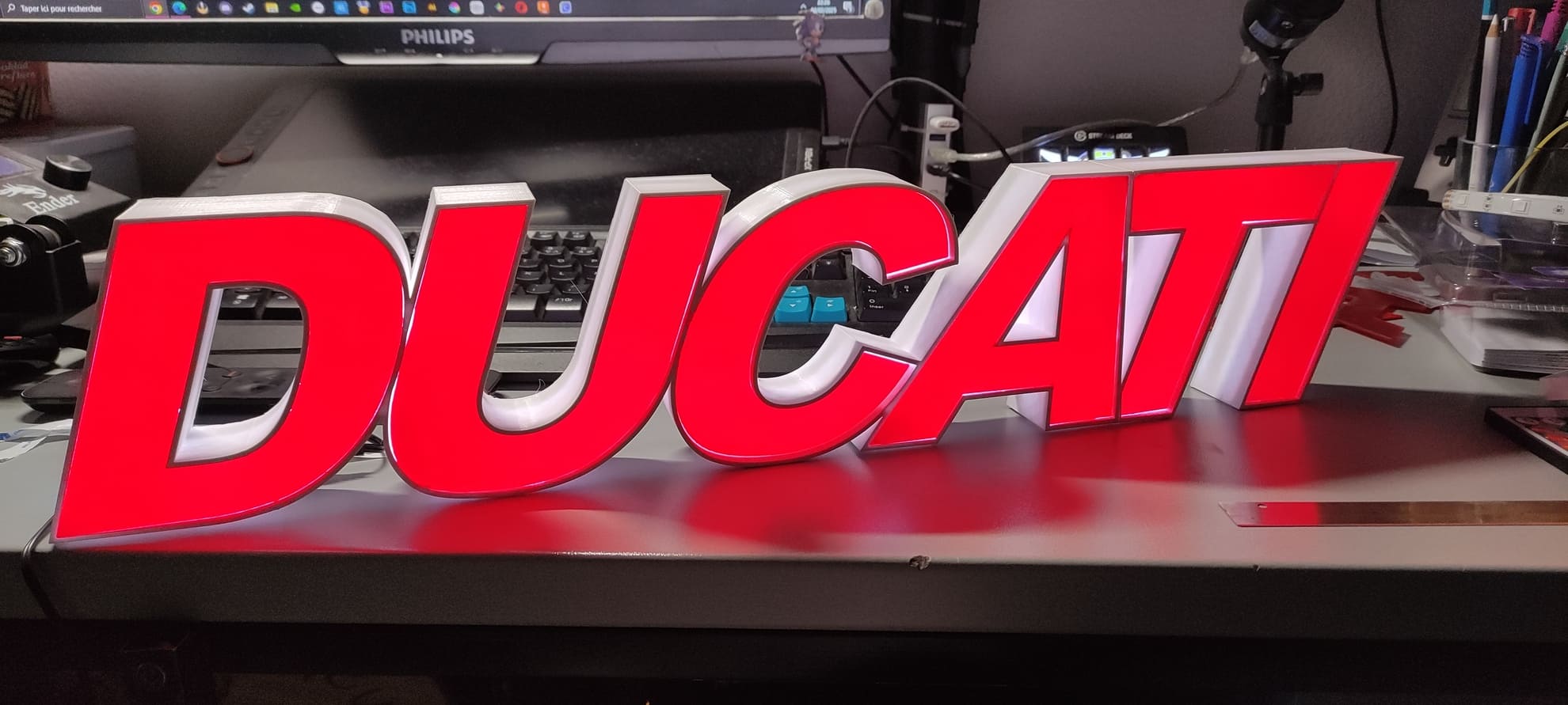 🏍️ Design emblématique : Reproduction fidèle du logo DUCATI en lettres capitales, cette lampe attire tous les regards, que ce soit dans un bureau, un garage, une salle de jeux ou un salon.